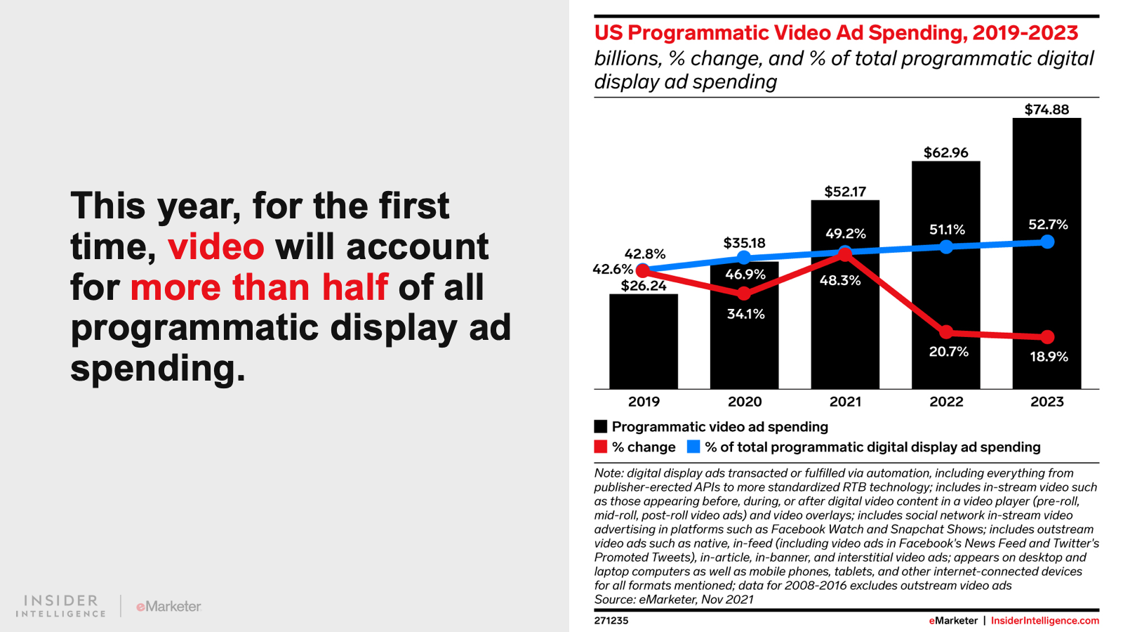 In 2022, US advertisers will spend $62.96 billion on programmatic digital video, up from $52.17 billion in 2021.