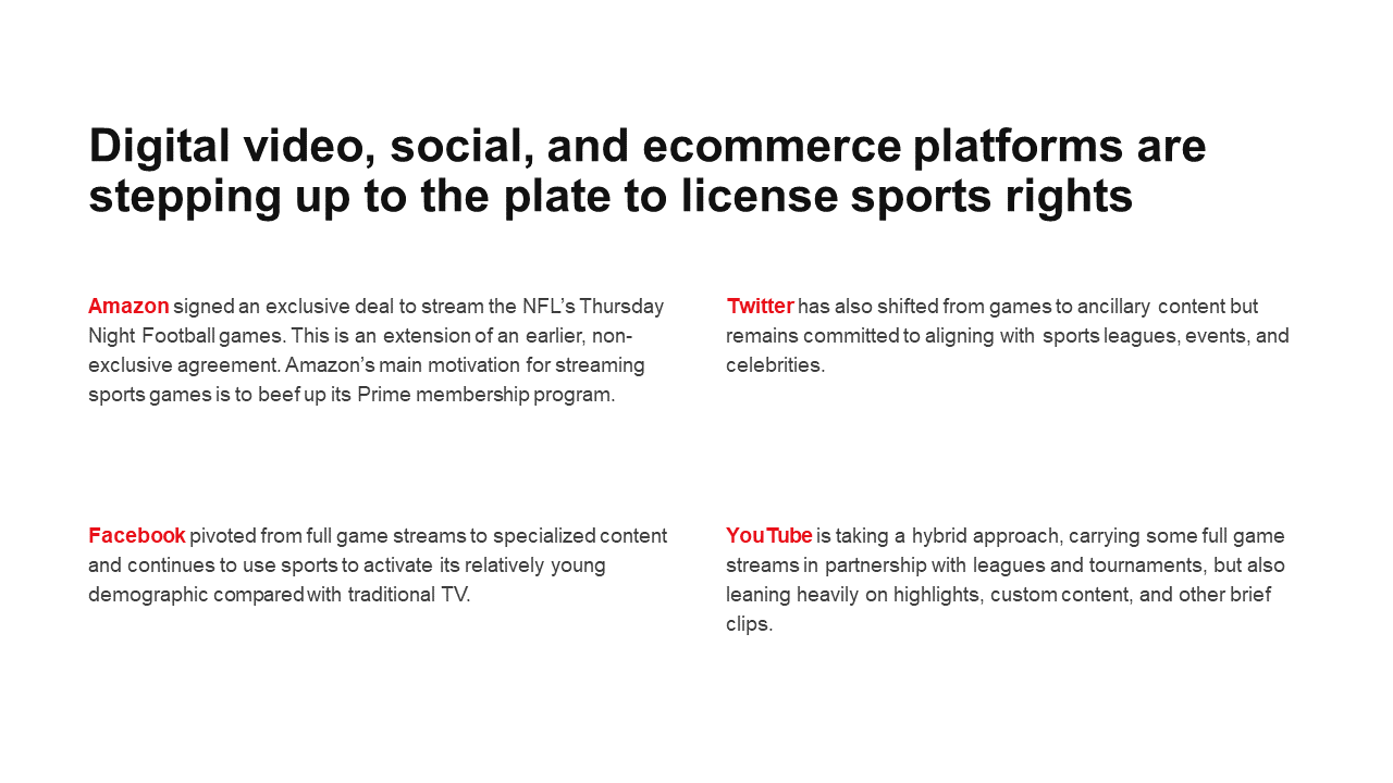 Led by the NFL, US sports leagues continue to command high prices for broadcast and streaming rights. Although some are willing to pay—like traditional broadcasters and Silicon Valley giants—there are questions about the sustainability of sports rights valuations, given the shrinking pay TV universe.