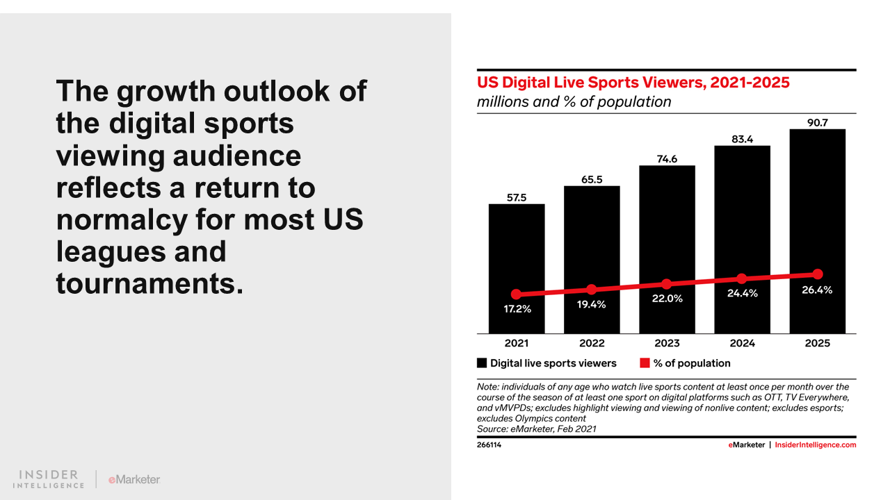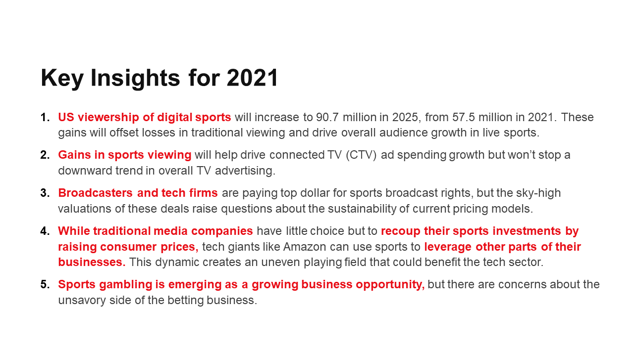 As US sports leagues and tournaments resume normal operations, the business of sports video is mostly back to pre-pandemic levels. Viewership will increase on the strength of digital platforms, while connected TV (CTV) ad spending and digital pay TV subscription revenues will also benefit. Legalized sports gambling is emerging as a marketing opportunity in the US. Despite these positive indicators, experts worry about the sky-high prices that sports leagues are commanding for broadcast and streaming rights.