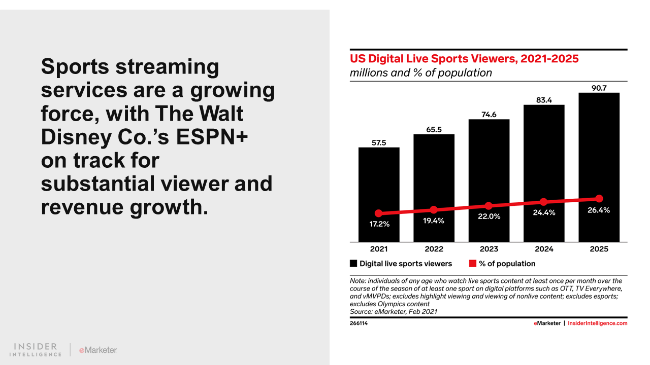 Viewership of digital live sports content in the US will reach 57.5 million this year and 90.7 million by 2025. This growth will come from digital platforms, including virtual multichannel video programming distributors (vMVPDs) and streaming services like Amazon Prime Video, which are ramping up their involvement. While traditional pay TV subscription revenues are declining, digital services—for which sports is a main attraction—are seeing increased revenues, as are sports-specific streaming platforms like ESPN+.