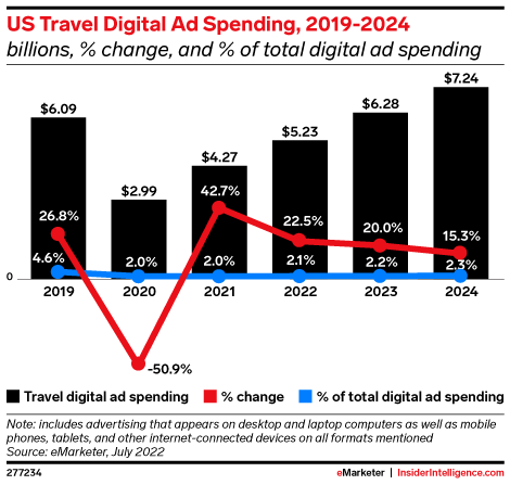 The travel industry’s digital ad spending collapsed in 2020, but two years later most of those outlays have returned. The next two years look set for strong growth as well, bucking the trend among other industries.