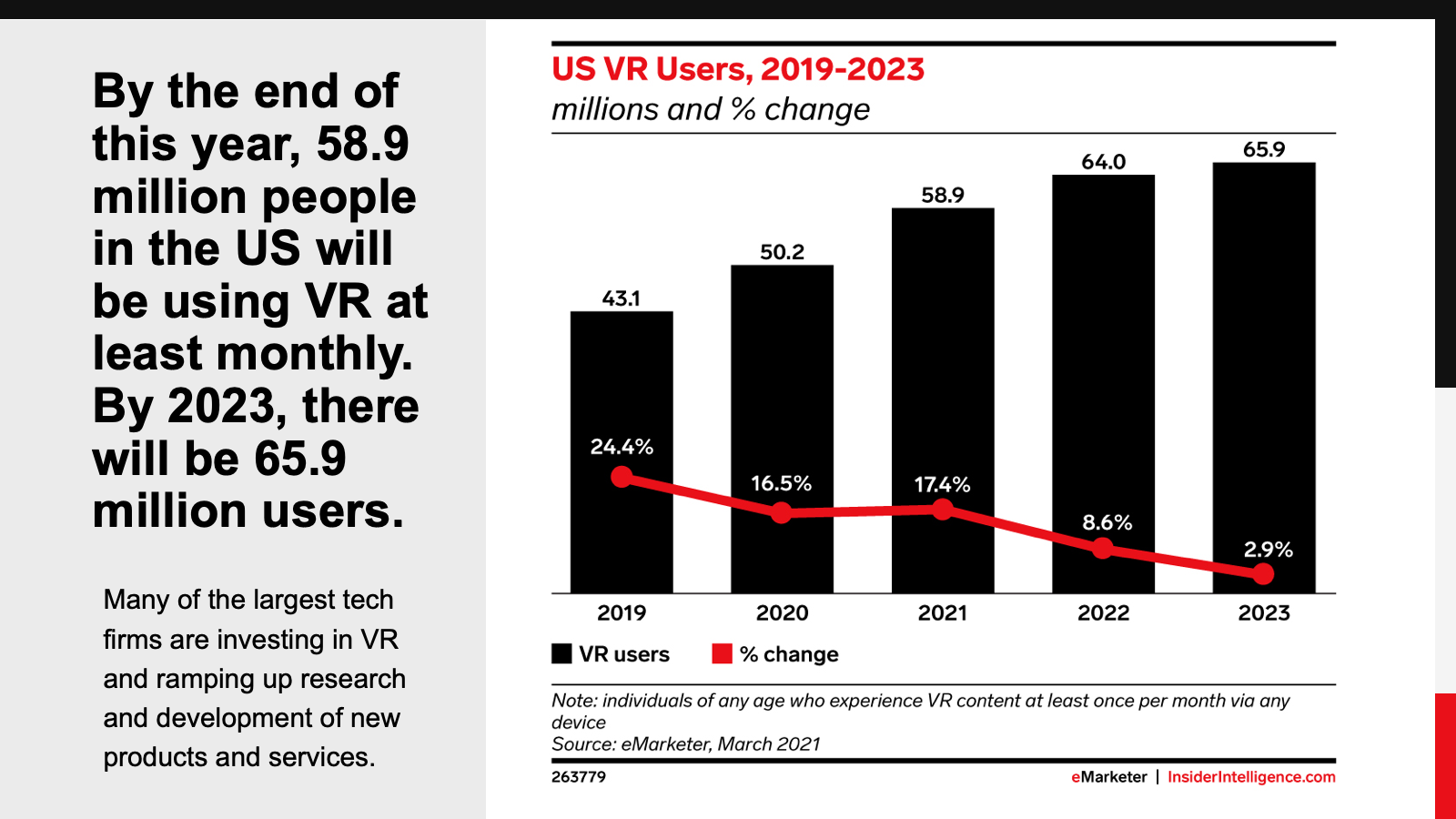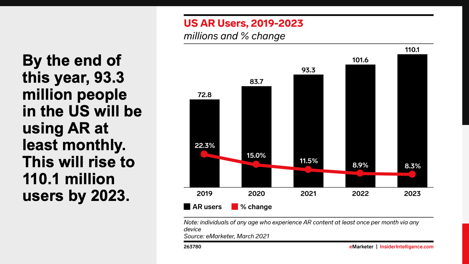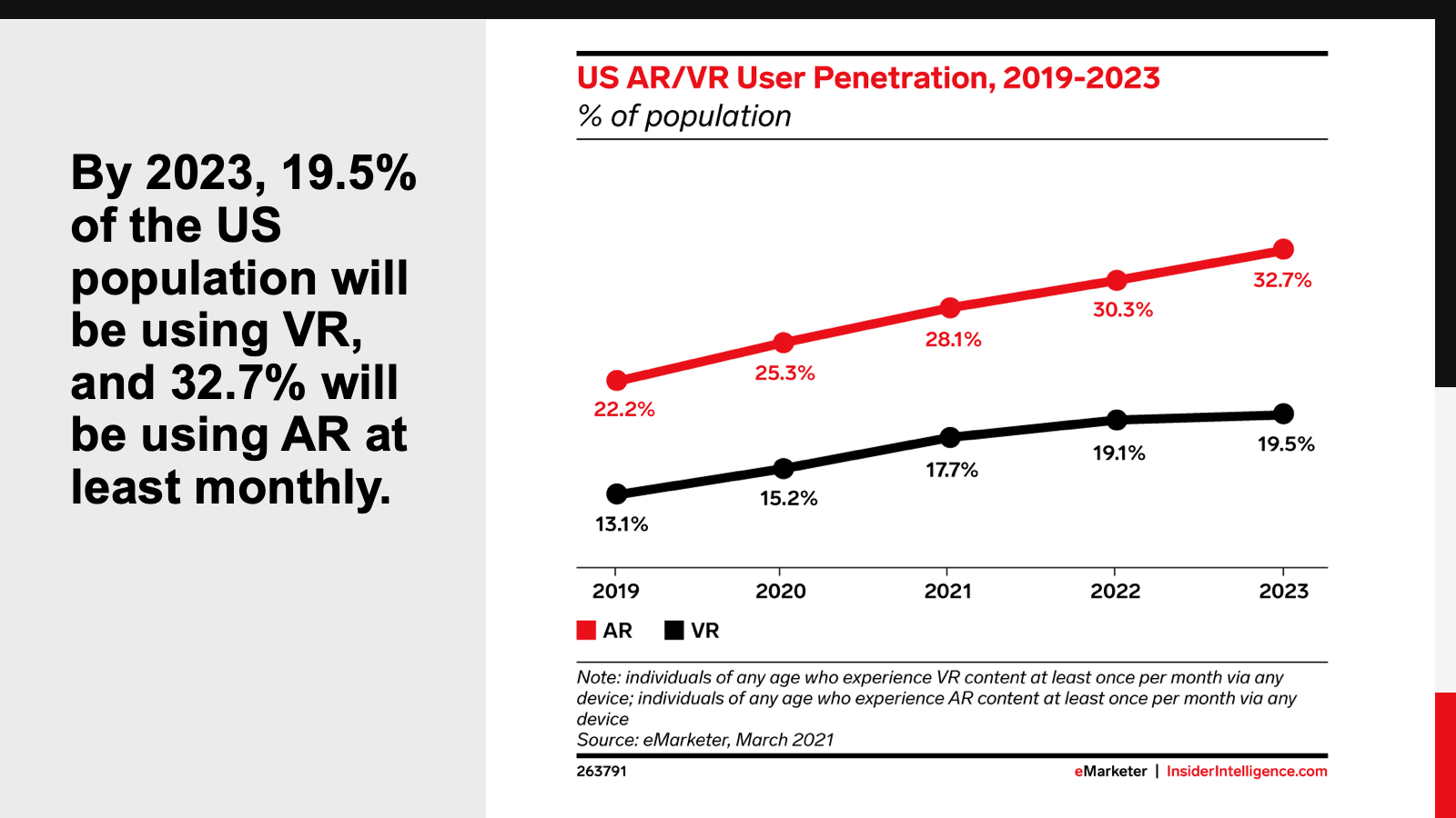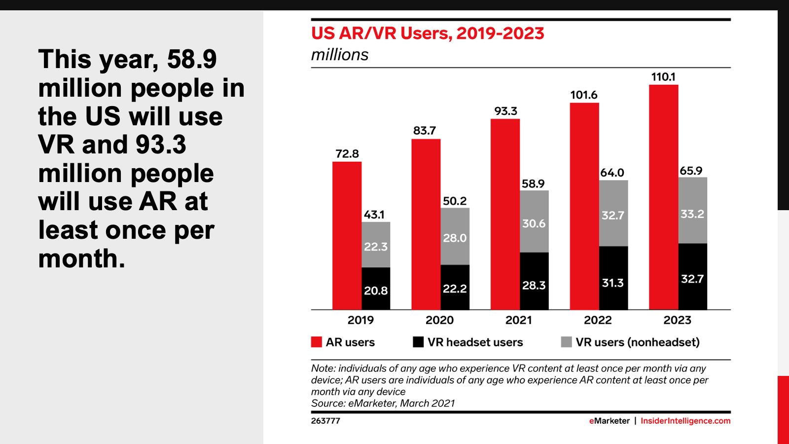 We expect 58.9 million people will use VR and 93.3 million will use AR at least once per month in 2021. These numbers represent 17.7% and 28.1% of the US population, respectively.
