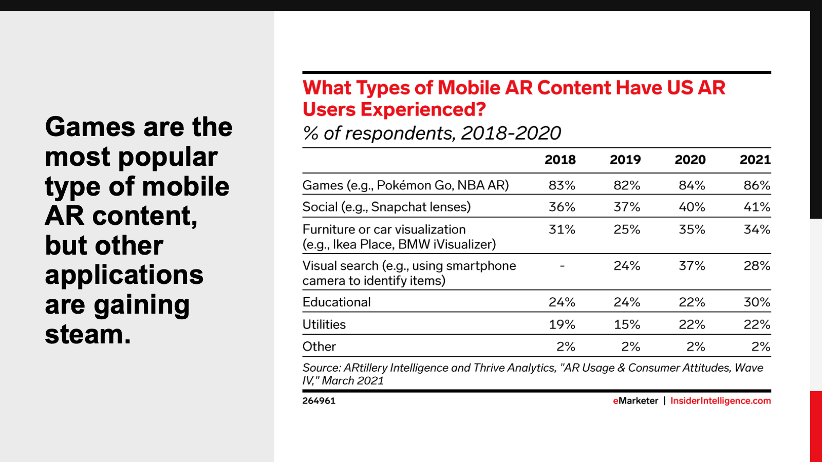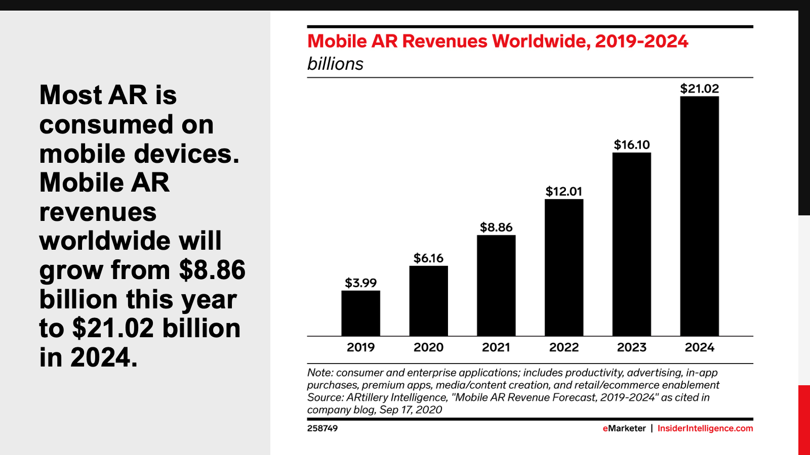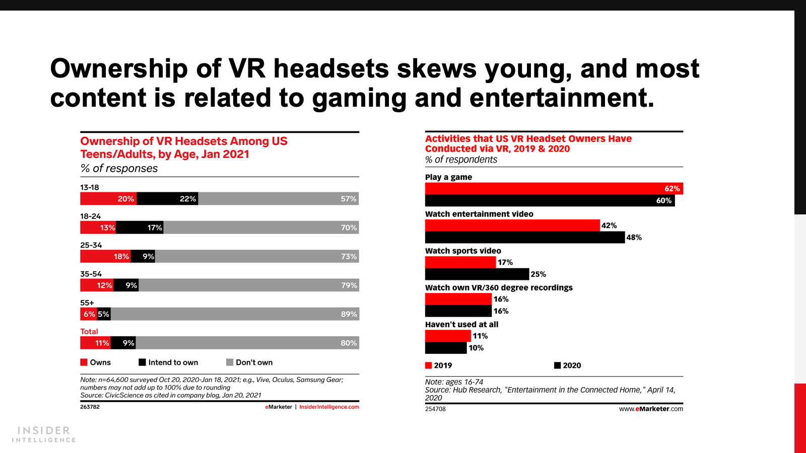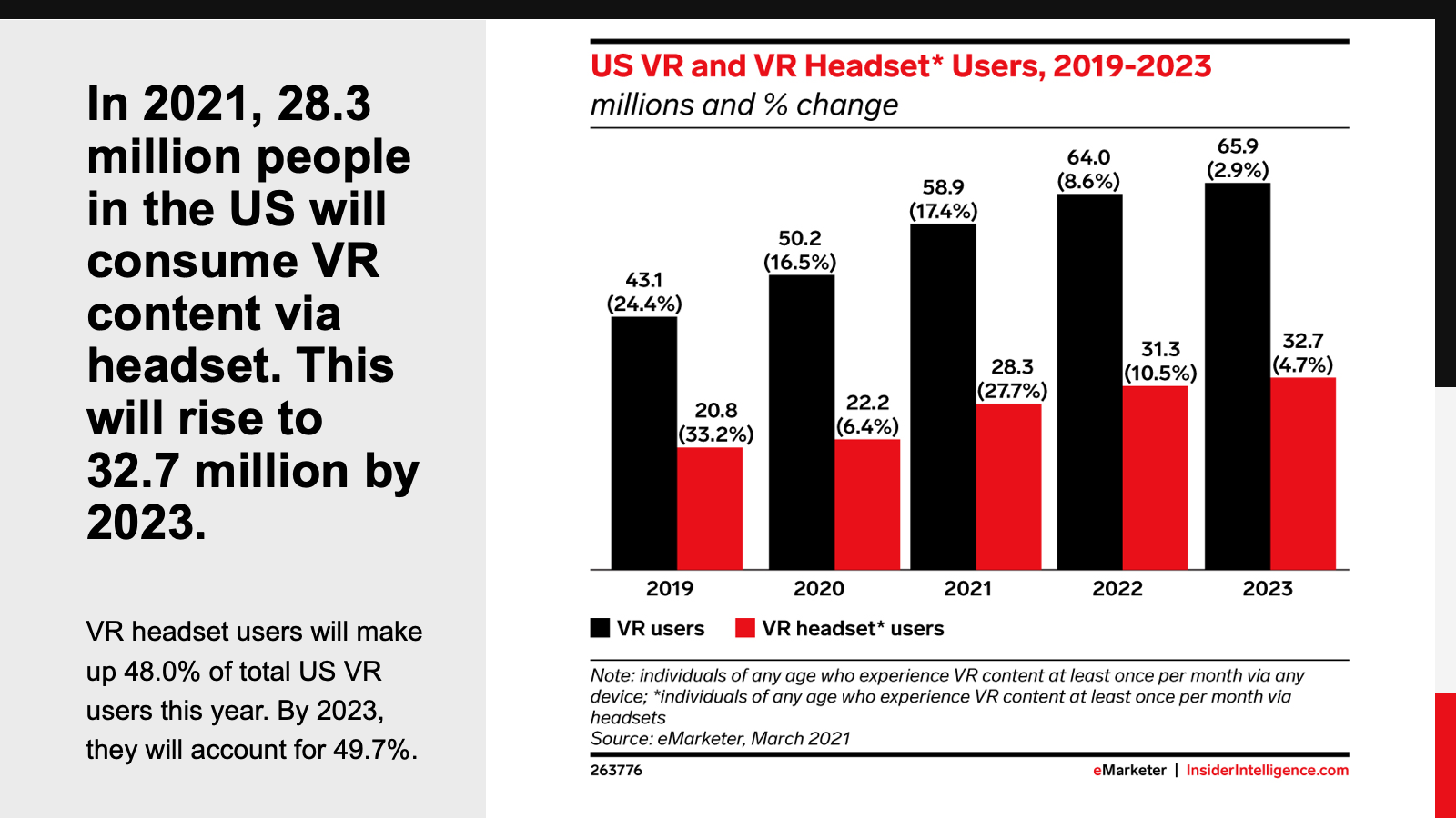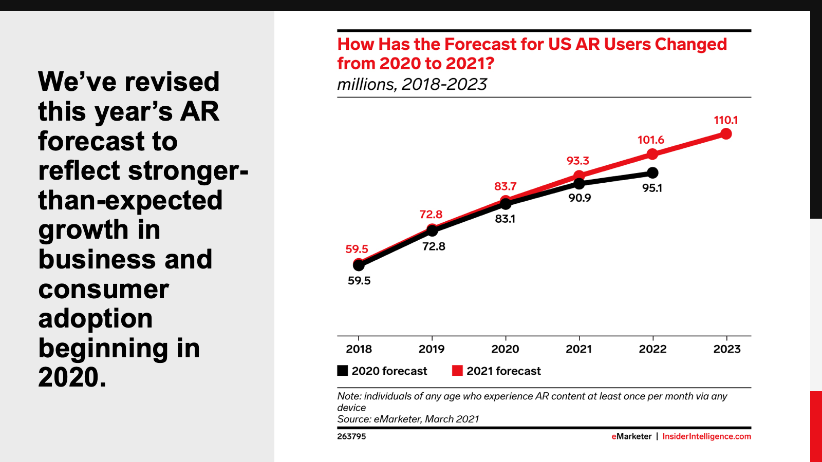 We expect 58.9 million people will use VR and 93.3 million will use AR at least once per month in 2021. These numbers represent 17.7% and 28.1% of the US population, respectively.