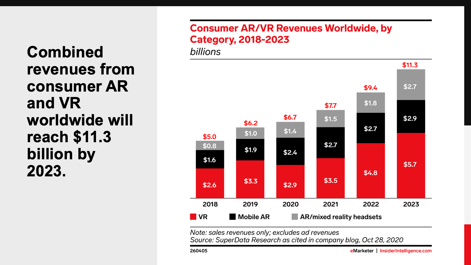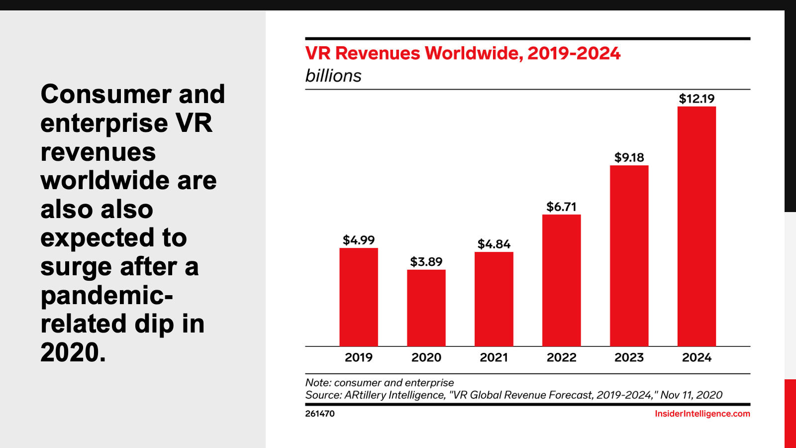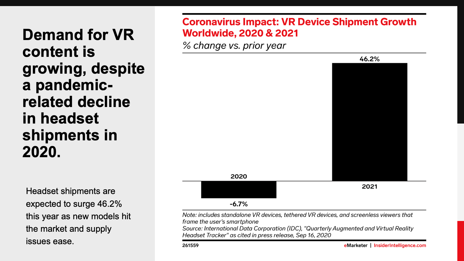 Because the pandemic has forced many people to work, socialize, study, and shop at home, they’re using XR experiences to replace in-person ones. While supply chain and distribution issues temporarily disrupted shipments of VR hardware in H2 2020, demand for all types of XR content will translate to more users over the forecast period.