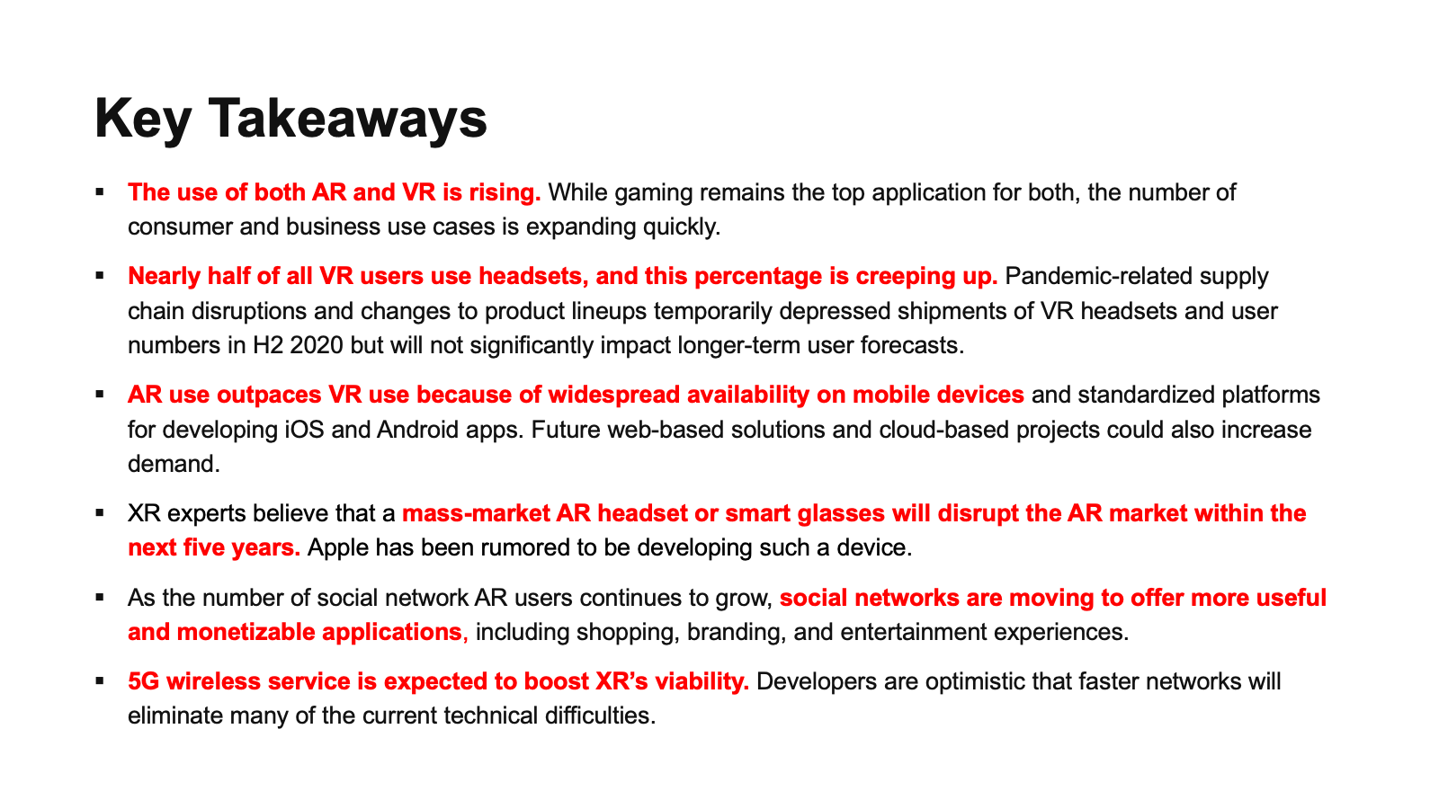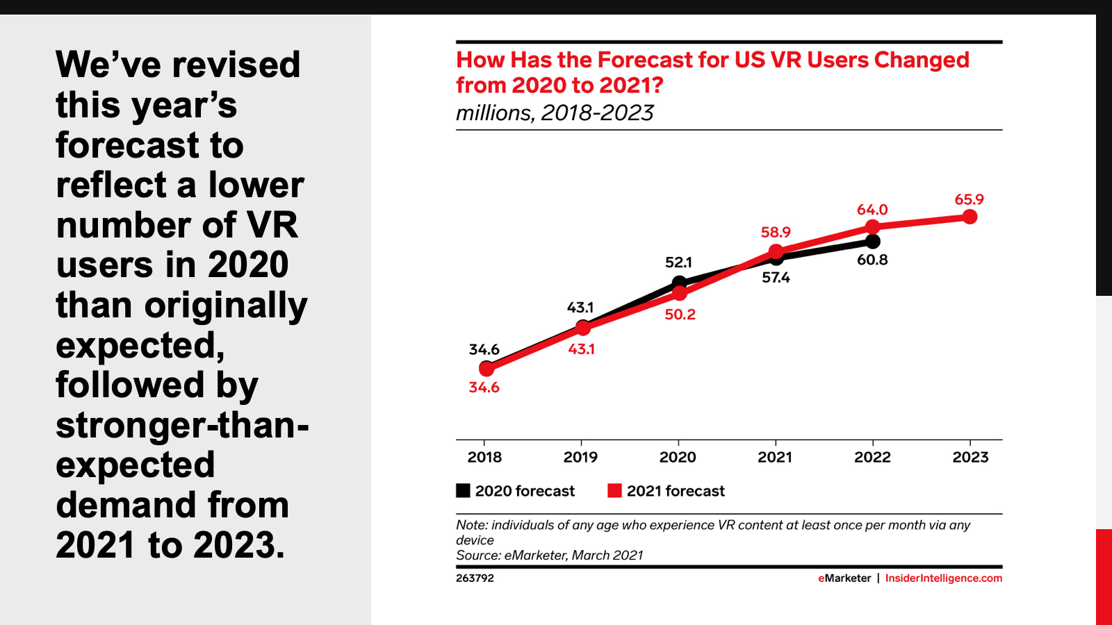 This year, we revised our previous estimates upward to reflect faster-than-expected growth in both VR and AR users. Pandemic-induced conditions have catalyzed interest in both technologies, and developers are stepping up to meet increased demand.
