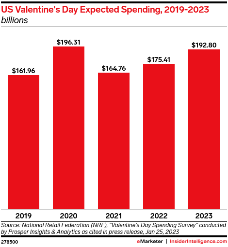 How consumer spending is changing: The average US consumer expects to spend $192.80 on the holiday, a 9.9% increase from $175.41 last year, and the second highest figure since NRF and Prosper started tracking Valentine’s Day spending in 2004.