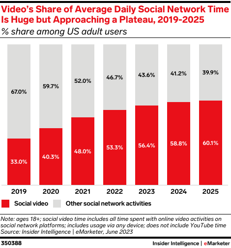 Key stat: Social video will account for 56.4% of overall daily time spent on social networks in the US this year, according to our forecast. Although that share will continue to grow, it’s approaching a plateau, and future gains will be smaller.