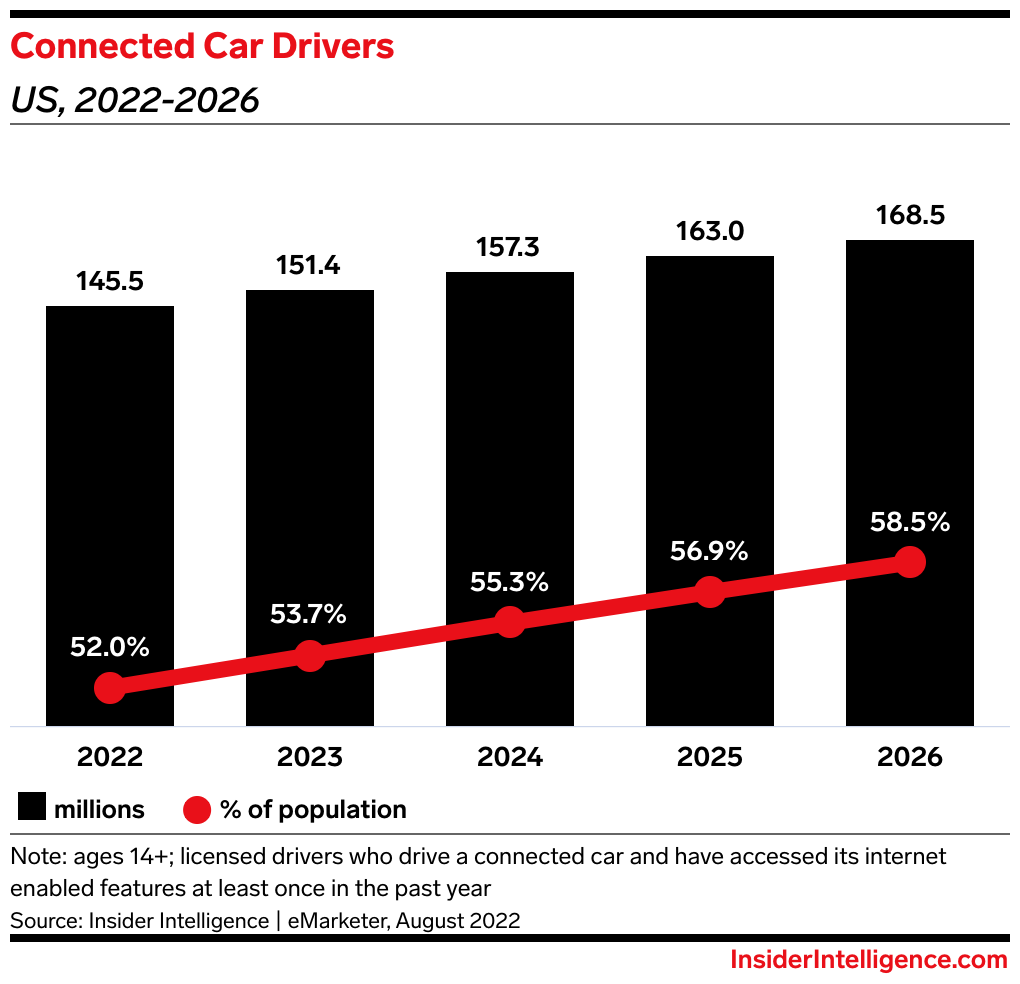 - 151.4 million people will drive connected cars in the US this year, per our forecast—53.7% of the US population.