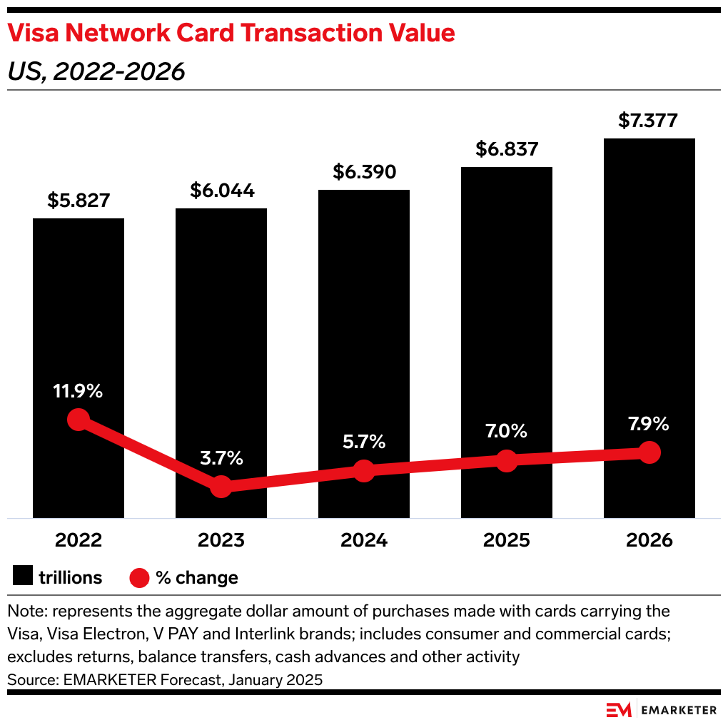 Our take: Strong international and non-card growth helps diversify Visa’s revenue and volume streams. We forecast Visa’s US card network transaction value will total $6.837 trillion this year, up 7% YoY.