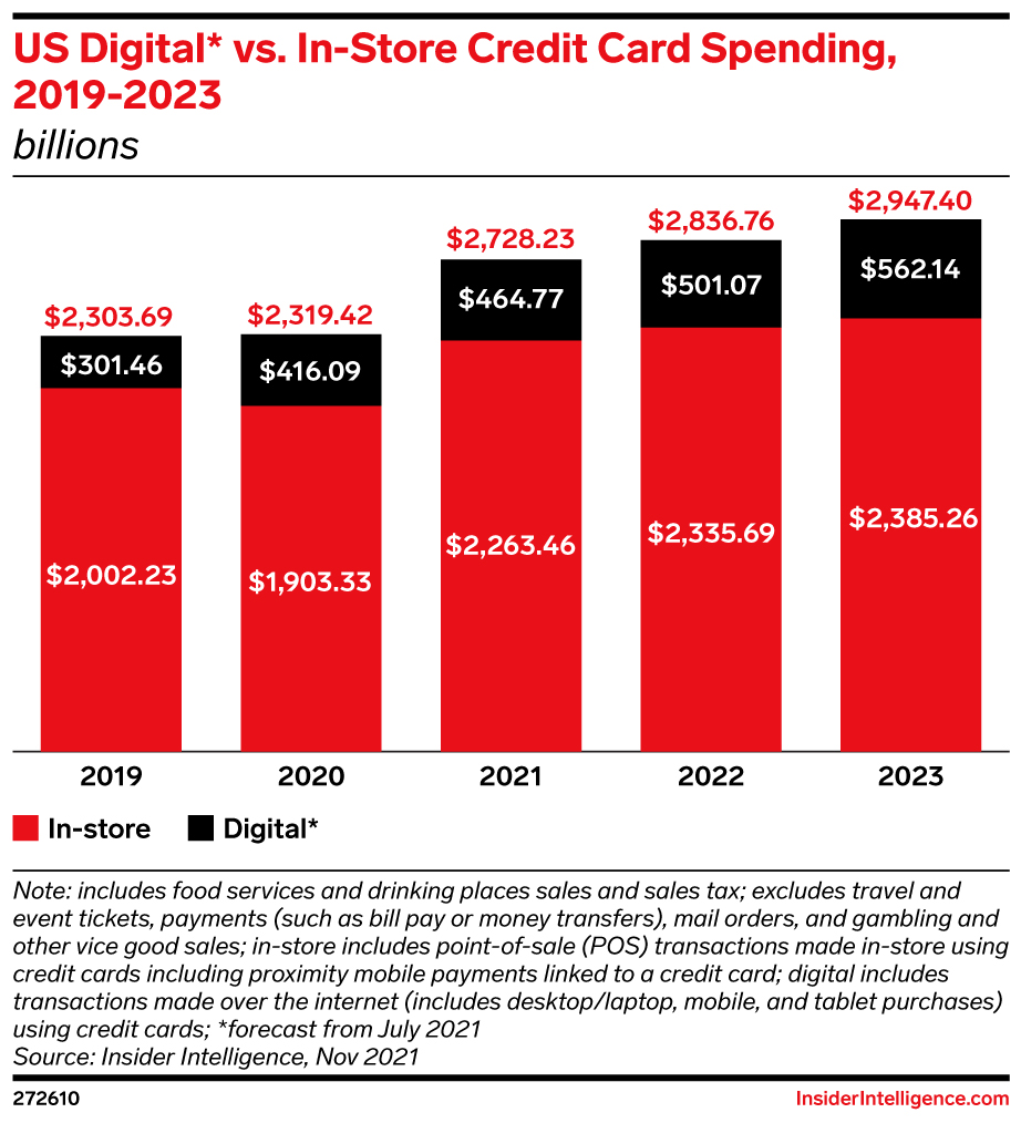 Key context: Transaction fees are critical to card networks and issuers for security and fraud prevention, innovation, and funding rewards programs and other value-added features. And transaction-based income will become even more important as card spending accounts for around 8 in 10 dollars spent across channels this year, per our forecasts.