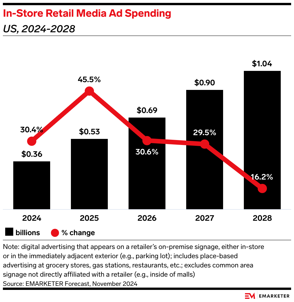 - Walmart also has a unique edge that retail media leader Amazon doesn’t: In-store inventory. With about 5,200 Walmart and Sam’s Club locations in the US, Walmart can offer in-store ad inventory that meets shoppers where they make purchases. We expect US in-store retail media ad spending to reach $360 million this year and $1 billion by 2028.