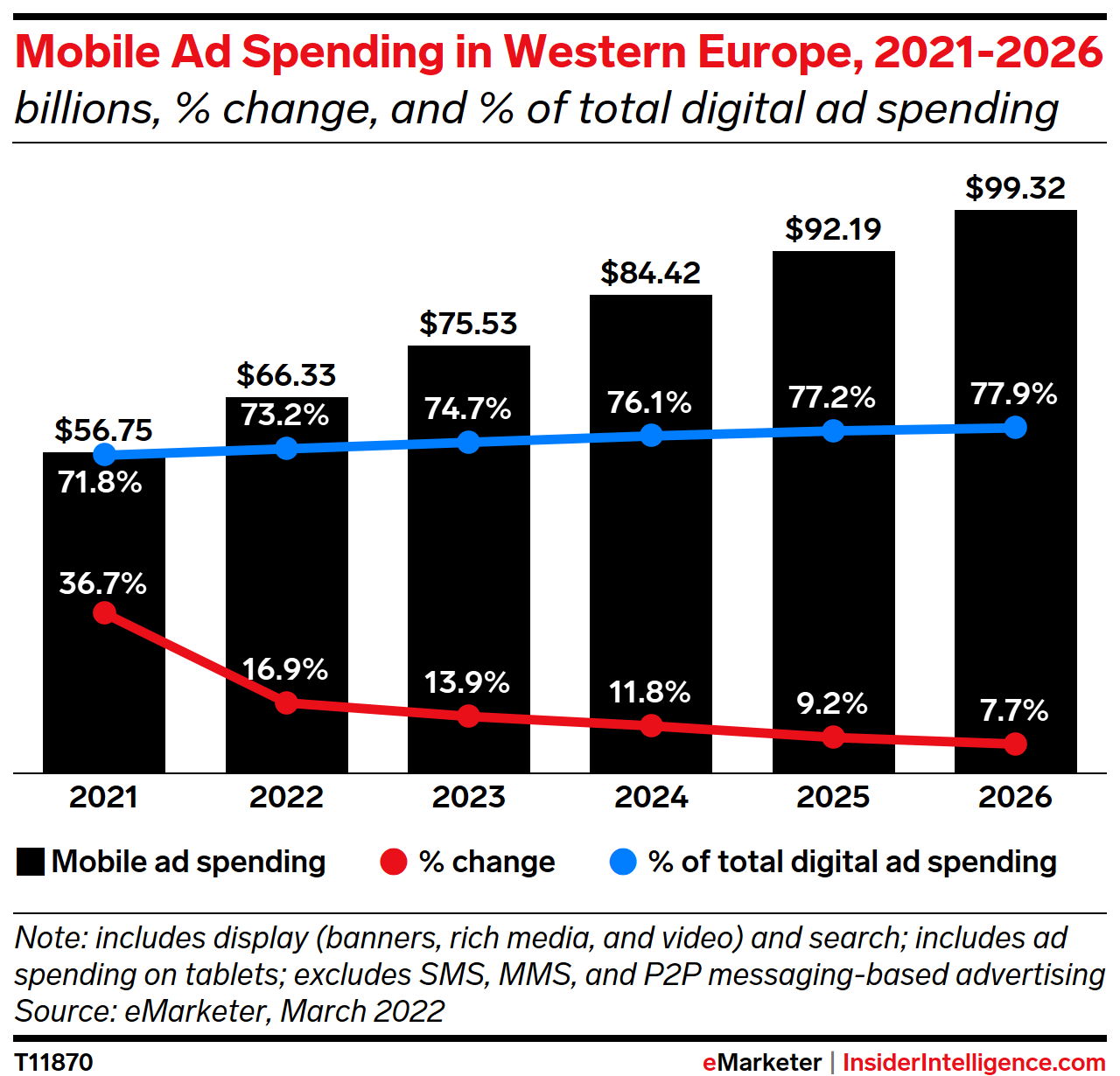 KEY STAT: Spending on mobile ads is rising much faster than any other ad category, as advertisers follow consumer eyeballs. Mobile ad spending in Western Europe will pass $66 billion in 2022 and approach $100 billion by 2026.
