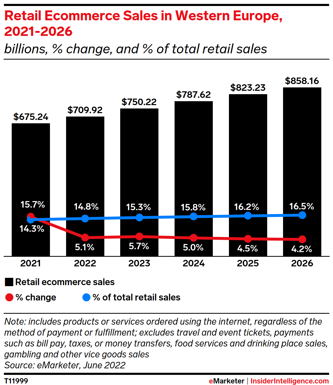 KEY STAT: Retail ecommerce sales in Western Europe will climb 5.1% in 2022 and surpass $700 billion. In 2023, digital sales in the region will reach $750.22 billion.