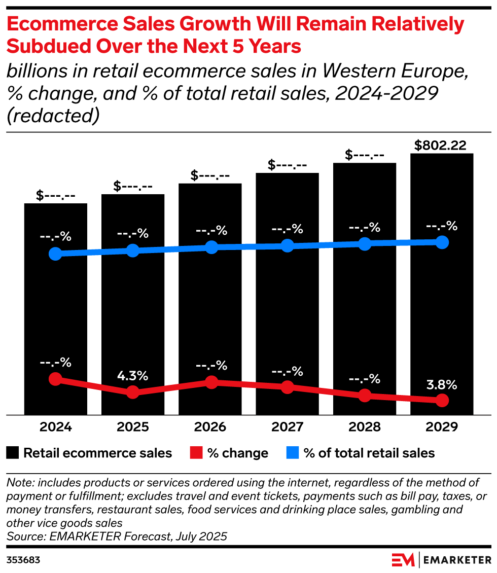 Key Stat: Ecommerce sales growth will stabilize at around 4% in Western Europe between 2025 and 2029, with the market set to surpass $800 billion by the end of the period.