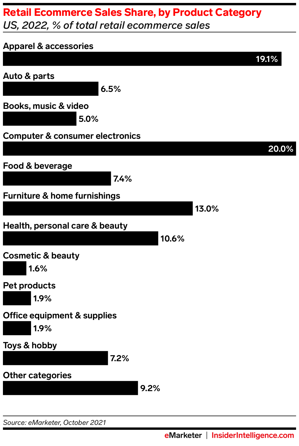 - While online retail sales are growing at a faster clip than offline sales, physical stores still account for the vast majority of US retail sales—particularly in the apparel and accessories category. Roughly 62.1% of US apparel and accessories sales will occur offline this year, according to our estimates.