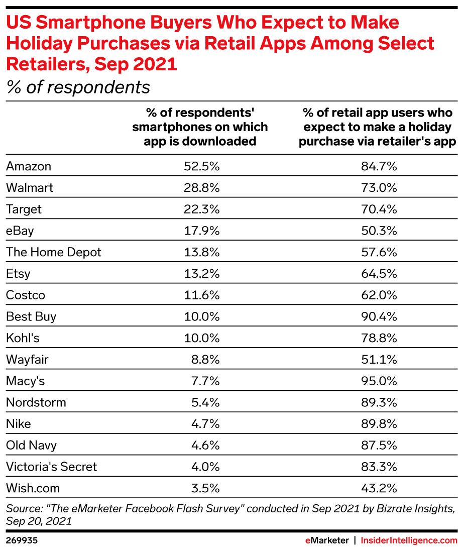 - Amazon had the top penetration among retail mobile apps at 52.5%, with 84.7% of those users expecting to purchase on the app during the holidays.