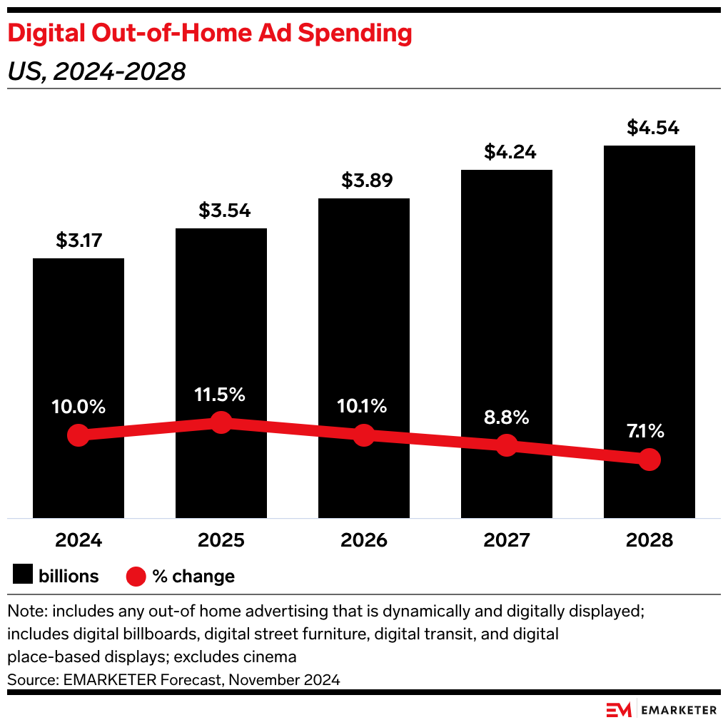 - US OOH ad spending will total $9.43 billion this year, up 3% from 2024, per our November 2024 forecast. Much of that growth comes from DOOH advertising, which will rise 11.5% this year to $3.54 billion. Traditional OOH will make up a larger share of overall OOH spending at $5.9 billion, but its share will decline 1.5% this year.