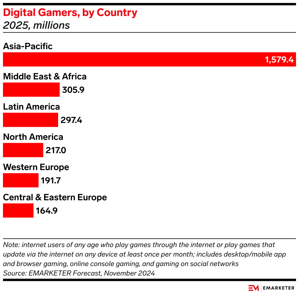 Key Stat: Asia-Pacific will account for over 57% of worldwide gamers in 2025, with 588.9 million coming from China and 460.7 million from India. But the fastest growth will come from the Middle East and Africa.