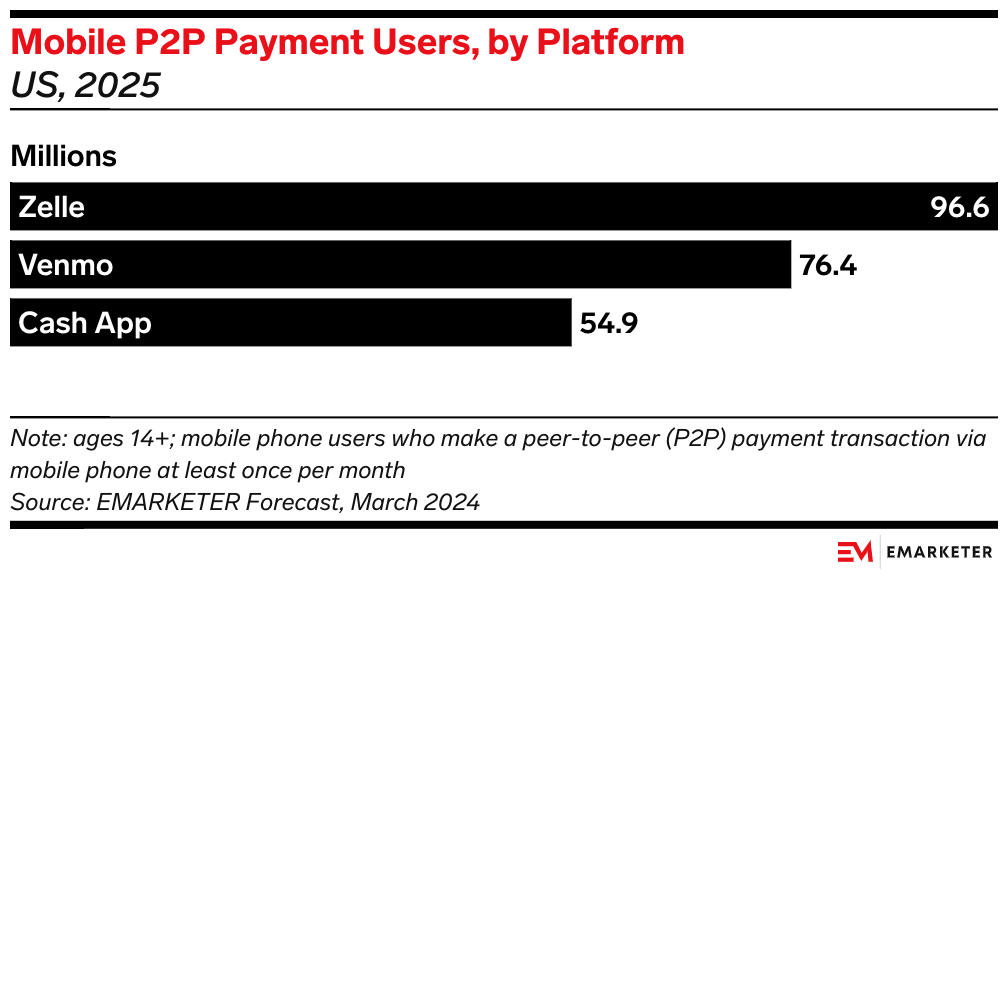 54.4% of all US mobile P2P payment users will make a transaction via Zelle at least once per month in 2025, per our forecasts.