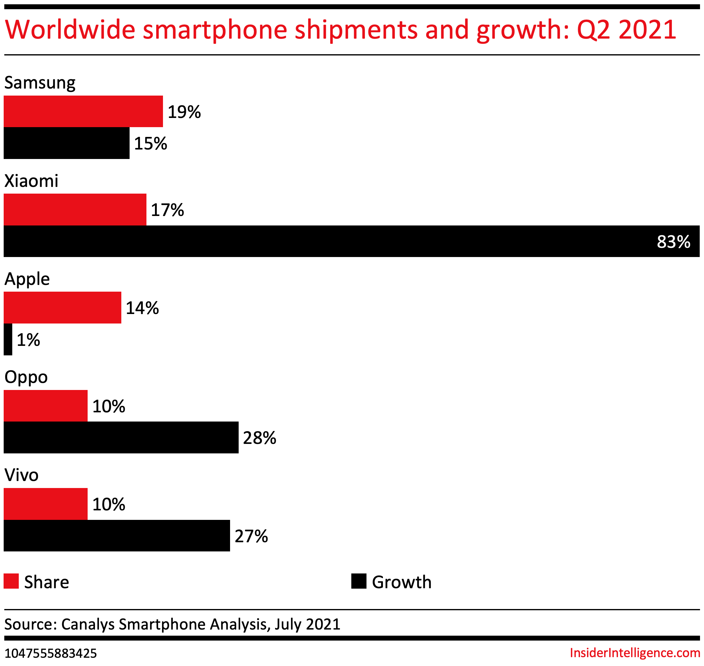 Samsung slipped to the No. 2 position in global smartphone rankings in June 2021, per Counterpoint. Samsung’s market share dropped to 15.7% as Xiaomi rose to the No. 1 position behind a rise in market share of 17.1%.