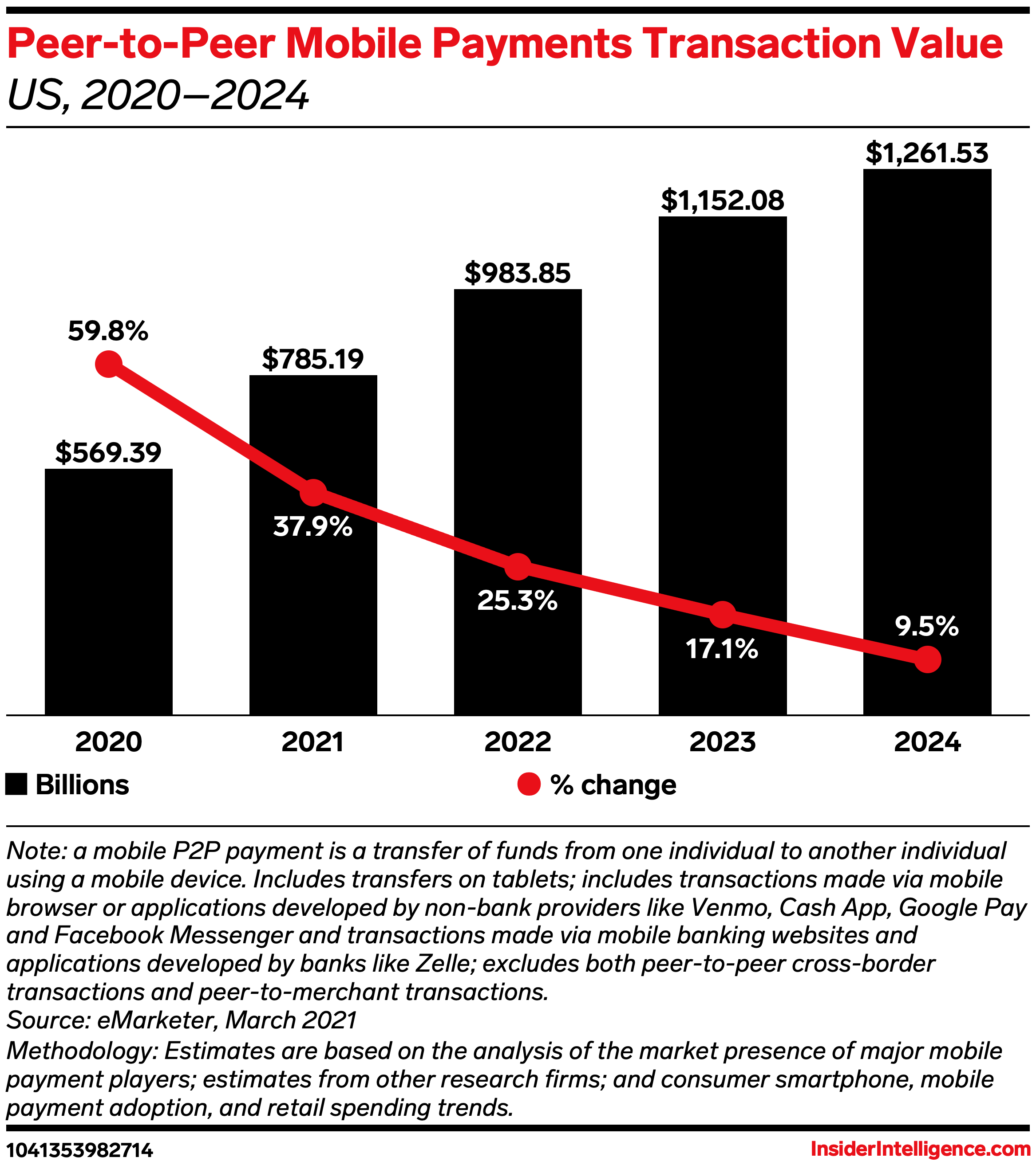 - The US P2P payments sector is projected to expand 37.9% and hit $785.19 billion this year, per Insider Intelligence forecasts. Providers will want to grab a bigger piece of the market: According to our forecasts, Venmo is expected to dominate the US market this year with a 57.5% share of P2P payment users, followed by Zelle (35.6%), and Square’s Cash App (30.8%).