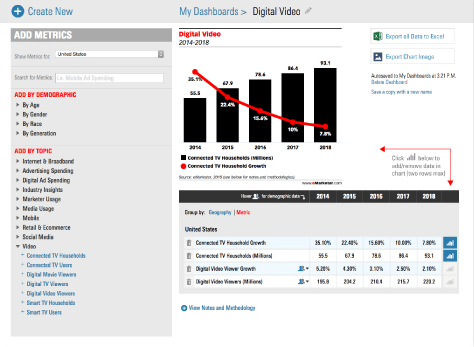 Empowering you to tell compelling stories with data, quickly and easily. Create your own custom charts and tables instantly by mixing and matching thousands of eMarketer data points.