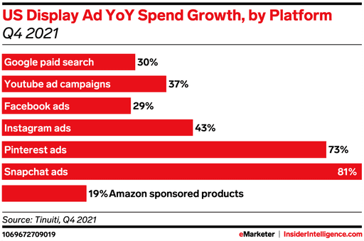 We value Tinuiti’s data because of its quarterly granularity, recency (the most recent data is from Q4 2021), and breakouts for ads on five social platforms, including Pinterest and Snapchat, which are not widely reported on.