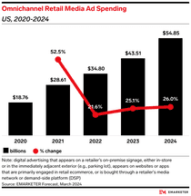 US omnichannel retail media ad spend will total $54.85 billion in 2024, a growth of 26% YoY, according to an March 2024 EMARKETER forecast.