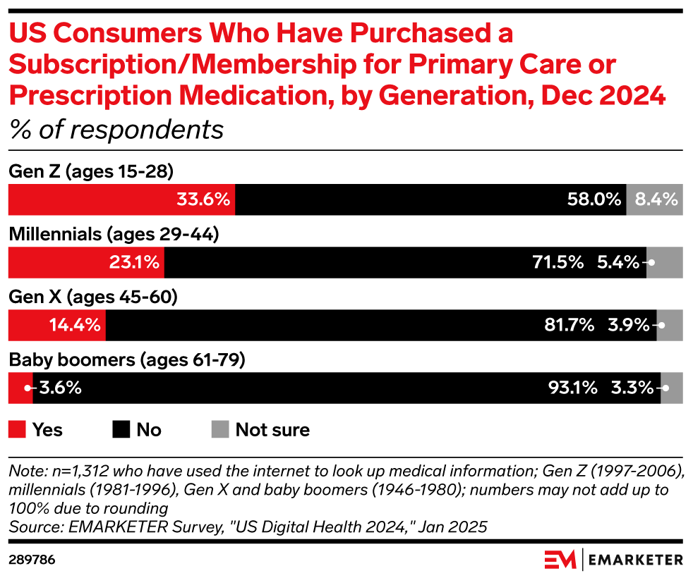The news: Rush University System for Health in Chicago is launching a subscription health model for patients seeking virtual urgent care. Our take: Legacy health systems are playing catch-up to D2C healthcare companies, and likely can’t offer a better customer experience. Telehealth is now a commodity, and success in the subscription healthcare space could come down to factors such as easy access to in-demand drug categories (e.g., GLP-1s, sexual health meds) and spending on digital channels such as social media to create brand awareness and more effectively reach younger customers.