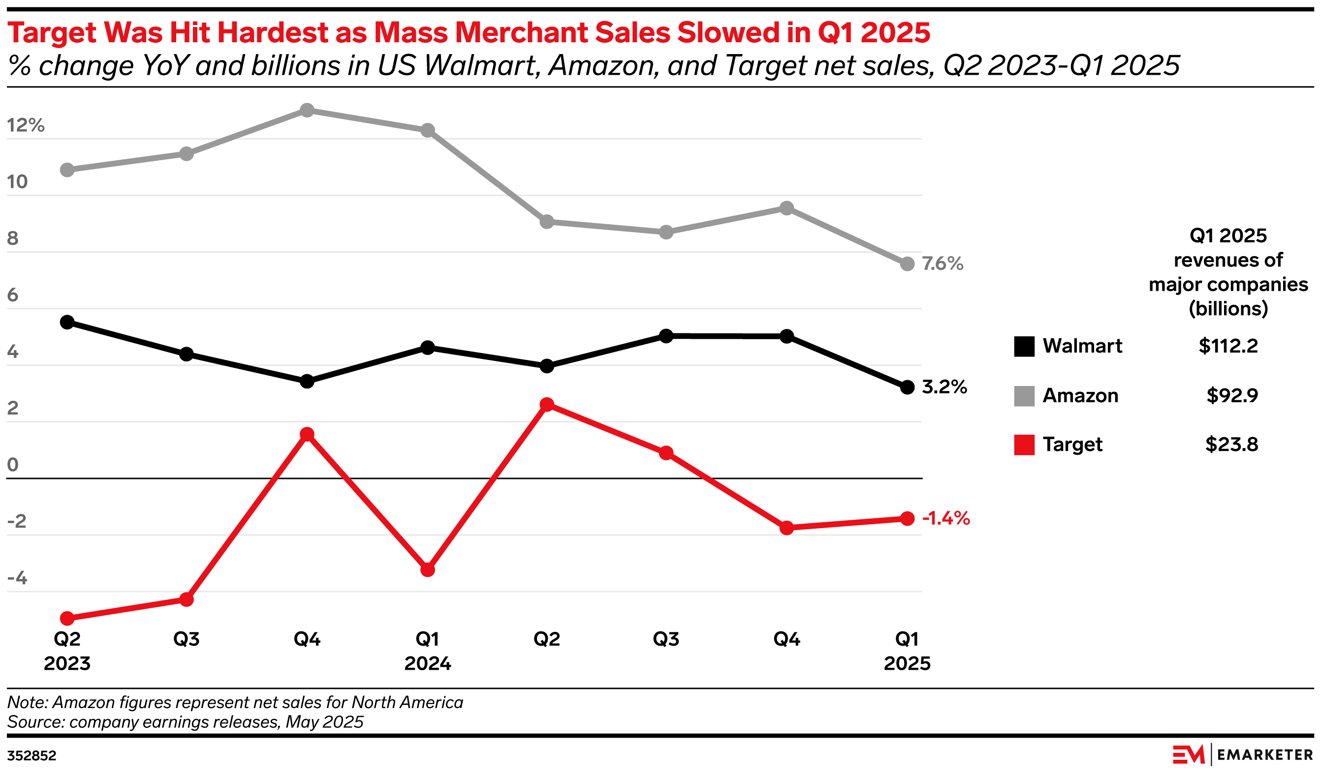 The insight: The gap between Target and its mass merchant competitors Amazon and Walmart is widening. While Amazon and Walmart are consolidating their grip on consumer spending after investments in value and convenience, Target’s largely discretionary assortment and diversity, equity, and inclusion (DEI) controversies are sharply curbing its appeal. Our take: Shoppers are prioritizing necessities over discretionary goods and favoring retailers that offer value and convenience.