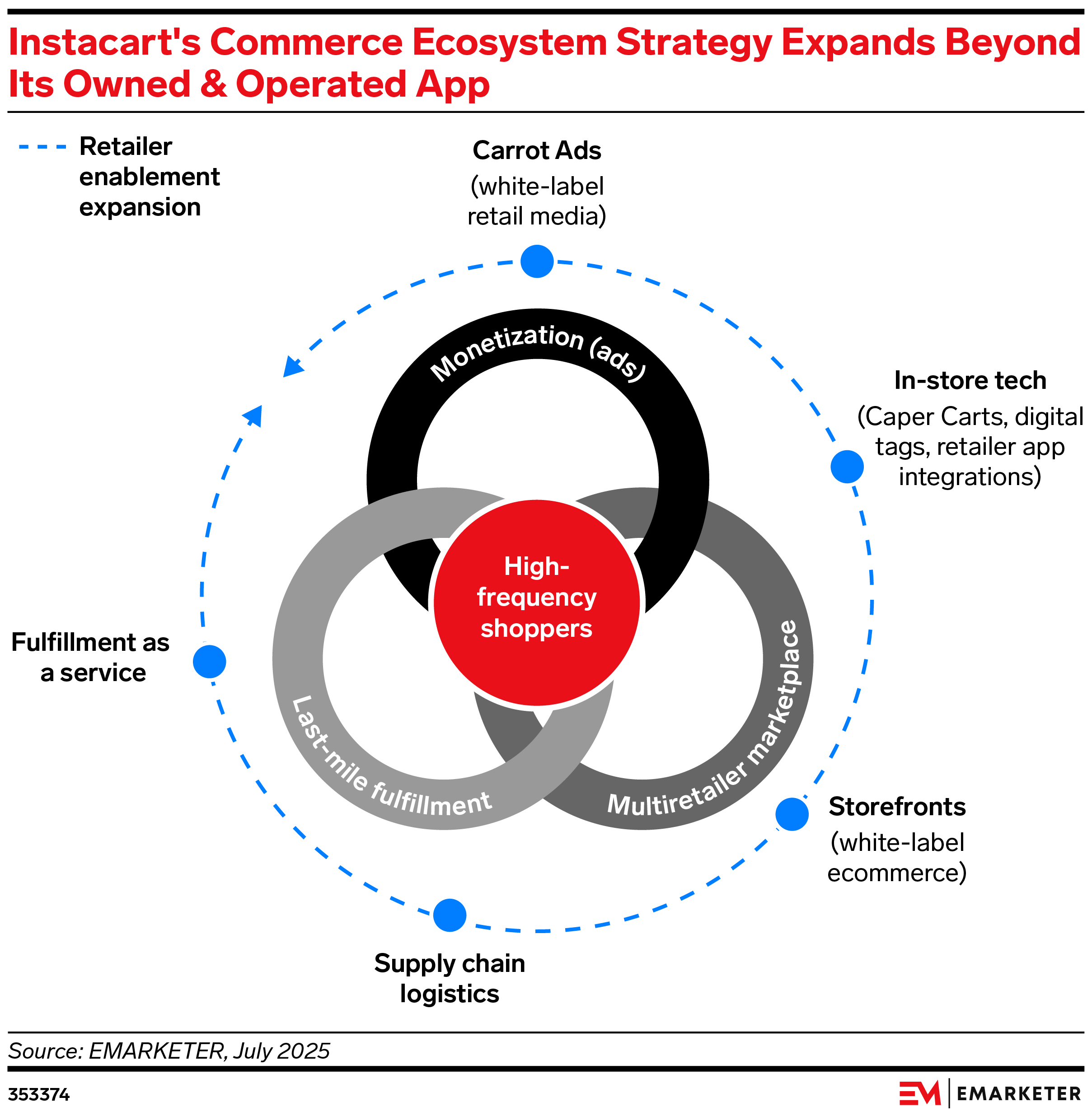 The news: Instacart’s efforts to win over more cost-conscious consumers and its growing suite of enterprise and advertising solutions helped the company handily beat Q2 expectations. Coming on the heels of record quarters for DoorDash and Uber, Instacart’s strong results point to resilient demand for delivery services in an otherwise challenging consumer environment. Instacart’s strong Q2 shows that the company is well-equipped to manage any slowdown in US digital grocery sales—as well as fend off growing competition from Uber and DoorDash. The surge in orders will be particularly reassuring to advertisers, particularly the many CPGs looking to increase marketing spend.