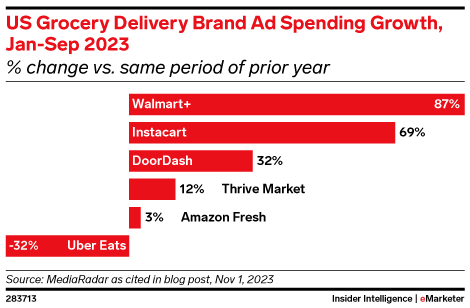 Walmart+ increased the money it spent on advertising by 87% between January and September 2023 as compared with the same time period in 2022, per MediaRadar.