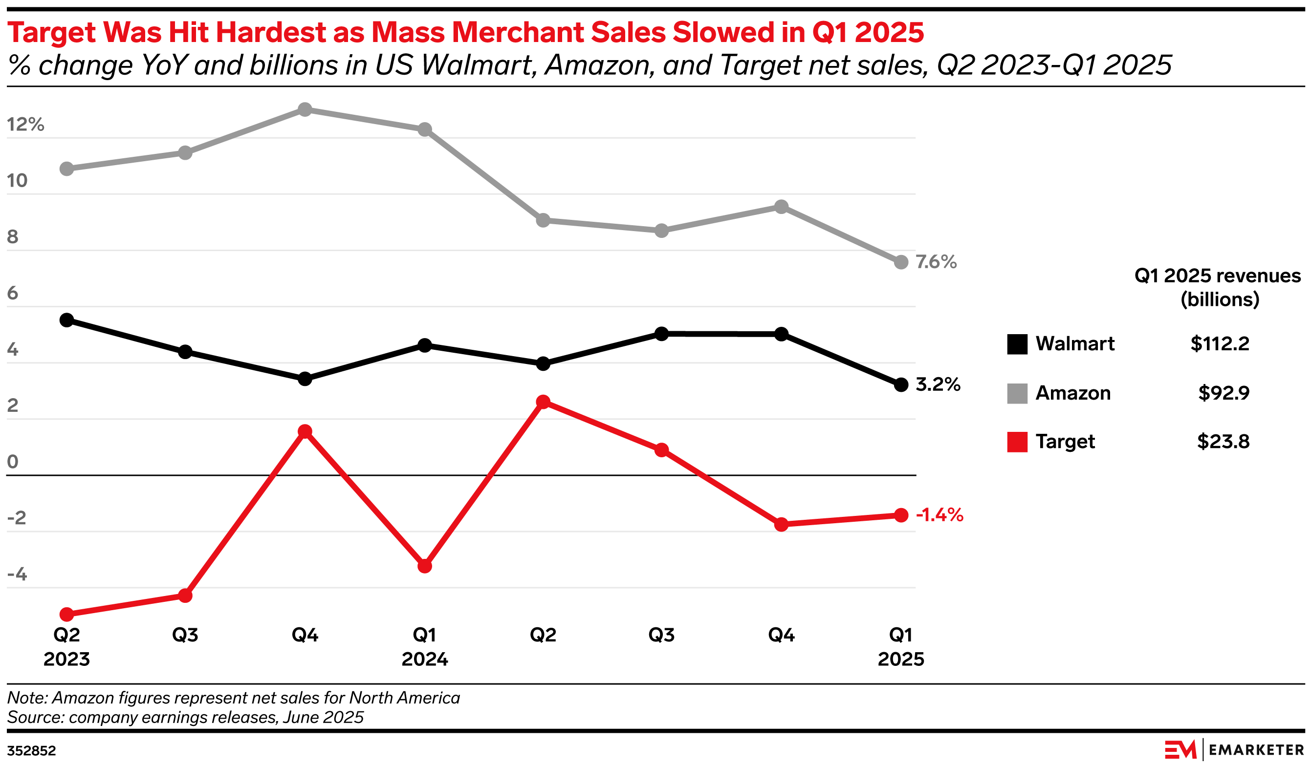 The Q2 performances of Amazon, Walmart, and Target illustrate the retailers’ diverging fortunes as shoppers reassess their spending priorities. While uncertainty is funneling more dollars toward Amazon and Walmart, customers are steering clear of Target—due both to a lackluster assortment and frustration over its diversity, equity, and inclusion (DEI) flip-flopping. Walmart and Amazon are pulling ahead as their relentless focus on value—in the form of speed, selection, and convenience—make them the first stop for shoppers buying everything from essentials like groceries to discretionary items like beauty and apparel. That leaves Target’s new CEO, Michael Fiddelke, with the unenviable task of having to turn the retailer around just as tariffs threaten its bottom line and undermine its core discretionary business.