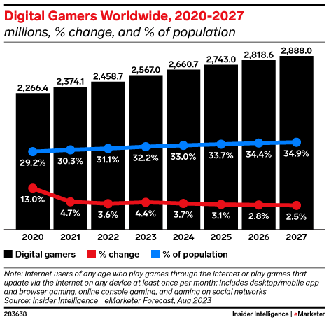 Digital gaming has become one of the most popular activities in the world, thanks mainly to the proliferation of smartphones and free mobile games. Here is our worldwide forecast for total gamers, with breakouts by region and for 13 countries.