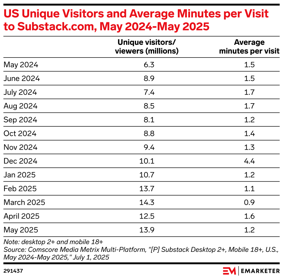 Substack is testing its first structured sponsorship program, allowing selected writers to insert paid brand placements directly into newsletters—an opt-in beta that keeps creators in full control and avoids programmatic ads. The move follows significant audience growth, with US uniques doubling in a year, but minimal marketer adoption: only 5% of brand marketers use Substack today. Sponsorships offer a way to monetize large free audiences while preserving the platform’s editorial identity. For advertisers, the beta introduces a premium, high-intent environment suited to thought leadership and niche expertise—an early indication that creator newsletters may become more formal components of influencer and upper-funnel strategy.