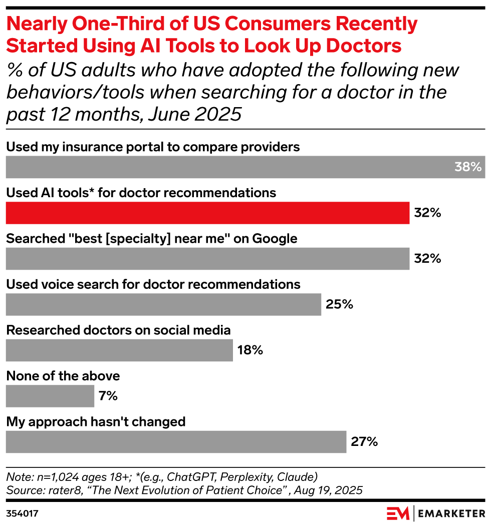 More consumers are turning to AI tools and social media platforms to research and select doctors, according to a new survey from rater8. Healthcare providers need to ensure that their business profiles are regularly updated online to be noticeable in local search results. They should also encourage their patients to leave online reviews while consistently responding, as this activity could boost relevance for AI algorithms. Social media content is also important, and should include testimonials from satisfied patients, along with posts from doctors that demystify complex medical information.