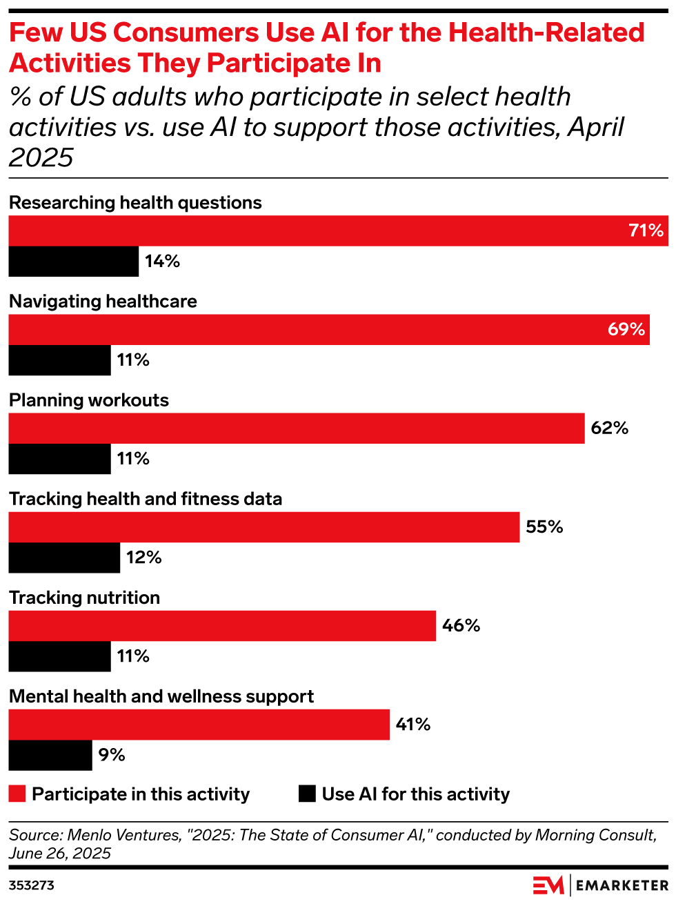 The trend: Few consumers use AI tools for the health and wellness activities they participate in, according to a recent survey from Menlo Ventures and Morning Consult of 5,031 U.S. adults in April 2025. The big takeaway: Consumers are right on the cusp of using AI as a health information tool. AI tools are getting smarter, but can still be unreliable—one faulty response to a query about a person’s symptoms or health condition can turn a user off for good. AI platforms must train their models on credible medical sources and collaborate with clinicians to review outputs for accuracy.