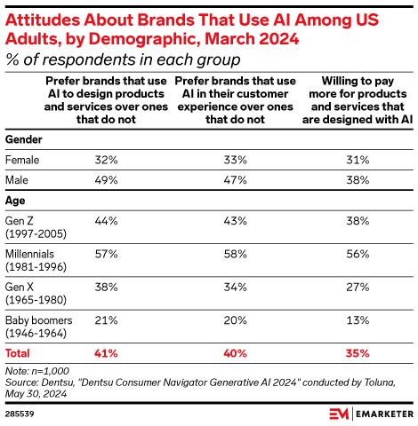 Consumers are cautiously optimistic about AI use. Over 100 million people will use generative AI (genAI) in the US this year, per our June 2024 forecast. But many are still distrustful of the tech as it relates to consumer privacy, personalization, and its capacity to hallucinate. Here are five charts demonstrating how consumers really feel about AI, and what marketers can do to make them more comfortable with the evolving technology.