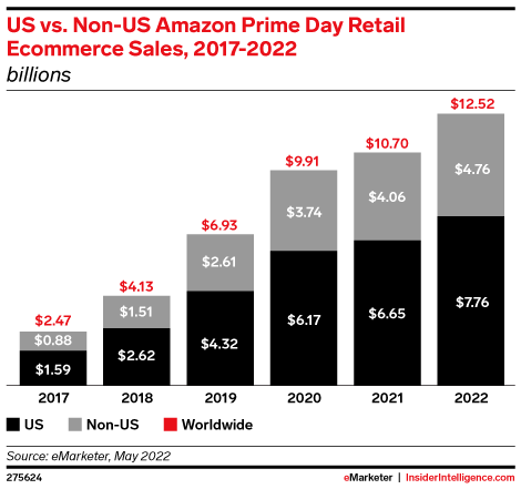 This year, Amazon will see $12.52 billion in Prime Day sales worldwide, per our estimates. The US will account for more than 60% of Prime Day sales, but outside of the US, sales growth will be stronger as Amazon brings the shopping event to more international markets.