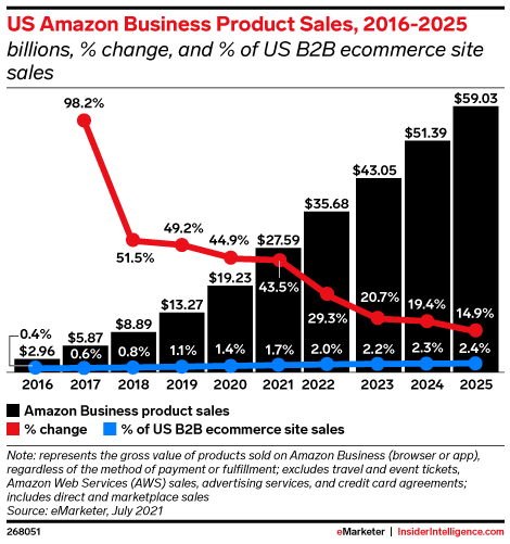 Amazon Business, which has grown rapidly since its launch in 2015, will increase its US product sales by 43.5% year over year to reach $27.59 billion in 2021.