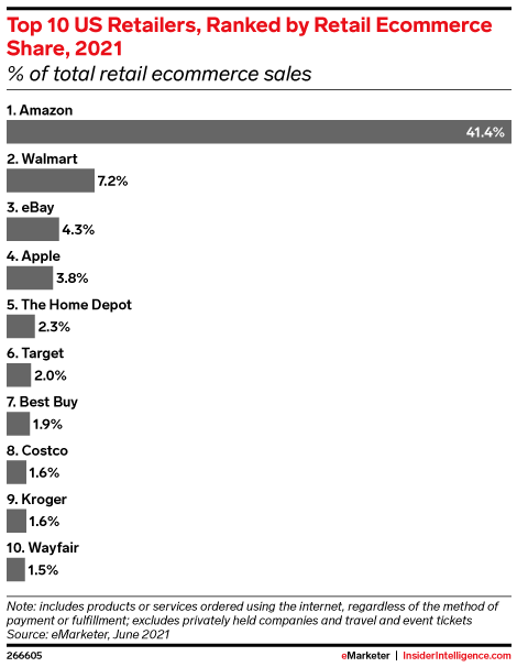 In 2021, Amazon will account for 41.4% of all US retail ecommerce sales. The tech giant will contribute more than 50% of US growth in online sales from 2019 to 2021. We estimate Amazon’s ecommerce sales will rise by $168.53 billion in that time frame, to reach a staggering $386.40 billion by the end of this year.