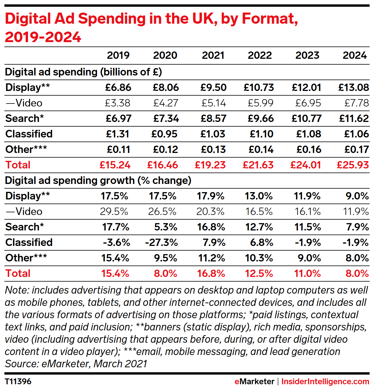 Search had a challenging time during the pandemic. Spend grew just 5.3% to £7.34 billion ($9.41 billion) in 2020, down from 17.7% the previous year and significantly down on our pre-pandemic estimate of 12.2% growth. However, this latest forecast is a reversal on our interim August 2020 estimate, when we expected a decline of 1.7% for the year.