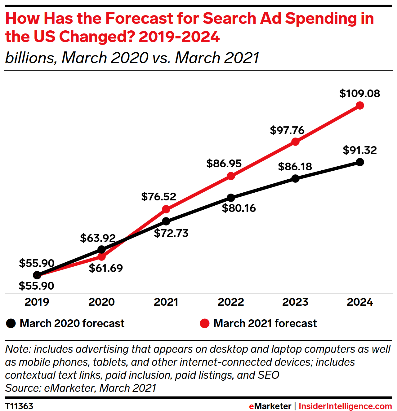 Traditionally, travel advertisers including online travel agencies are among the biggest search ad spenders on Google. That business tanked last year, but ecommerce-related search advertising outperformed thanks to the supercharged digital retail environment.