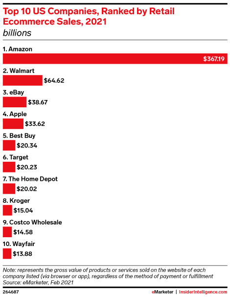 Our latest forecast shows that Amazon, Walmart, and eBay will remain the top three largest ecommerce companies in the US by total sales volume, while Best Buy and Target will usurp The Home Depot and Wayfair for the No. 5 and No. 6 spots on the 2021 list, respectively.