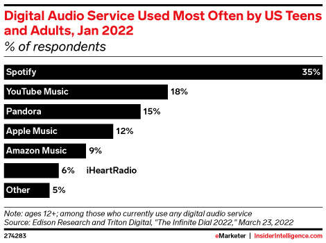 Spotify is the No. 1 digital audio service among US teens and adults, with 35% digital audio listeners ages 12 and older using that platform the most. YouTube Music comes in at No. 2, with 18%, while Pandora rounds out the top three at 15%.