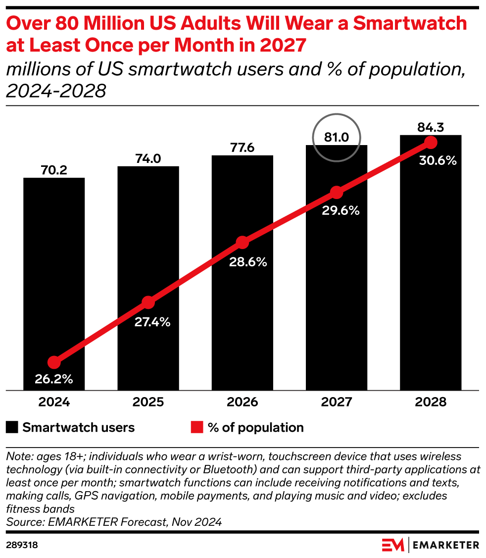 The news: Apple is bringing back blood oxygen monitoring for Apple Watch as part of its health and wellness features. Apple discontinued the feature in the US in 2023 after a patent dispute and court ruling forced the halt. The takeaway: Apple still leads smartwatch brands with a 22% market share, but its dominance has slipped. Health and wellness features incorporating AI assistance are key for future growth. Tech companies should market wearables as health tools for consumers, especially to older demographics who have greater health needs but lower smartwatch adoption rates.