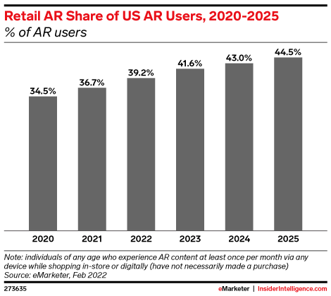 Nearly 2 in 5 augmented reality (AR) users in the US will shop with the technology this year, for a total of 35.0 million retail AR users. That base is up 18.8% from last year and will continue to grow at double-digit rates through 2024 as shoppers make use of virtual try-on and product visualization features.