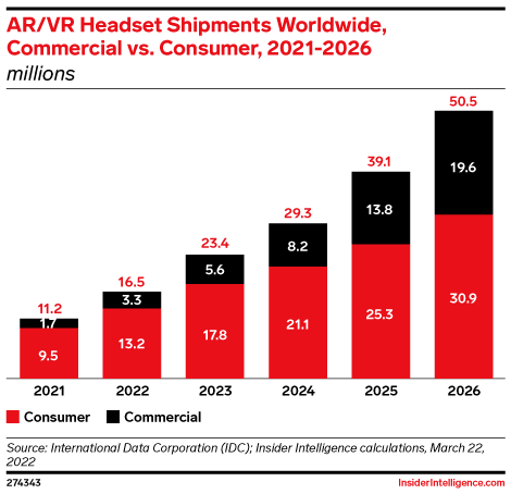 Global shipments of augmented and virtual reality (AR/VR) headsets will hit 16.5 million this year, up more than 5 million or 32.1% from last year. Most of these shipments are to consumers, but commercial sales are set to multiply over the next five years, driven by the opportunity for product visualization prior to purchase.