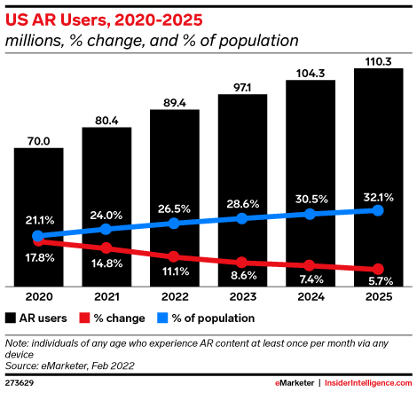 Once the domain of gamers and young social media users, AR and VR are entering the mainstream. This year, more than a quarter of the US population will use AR and nearly a fifth will use VR. As device-makers improve VR headsets and AR spreads to new use cases, the number of AR and VR users will continue to grow over the next four years, with AR outpacing VR.