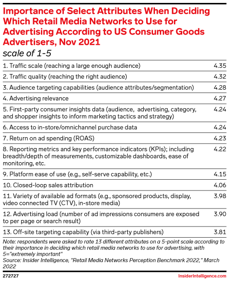 Here’s how ad buyers ranked the retail media networks of 14 leading CPG-focused retailers—including Ahold Delhaize, Albertsons, Amazon, Costco Wholesale, CVS, Instacart, Kroger, Target, and Walmart—according to the attributes they value most.